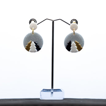 Celebra la temporada festiva con los pendientes Miren, un diseño circular con fondo gris perlado y tres delicados árboles navideños en tonos blanco, dorado y negro. Elaborados a mano en Galicia con arcilla polimérica de alta calidad, estos pendientes combinan elegancia y espíritu navideño en una pieza única. Su ligereza y acabados detallados los hacen perfectos para acompañar tus looks invernales, tanto en eventos especiales como en el día a día. Forman parte de la colección limitada de Navidad, disponible solo hasta el 14 de diciembre.